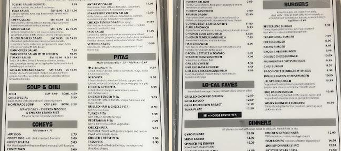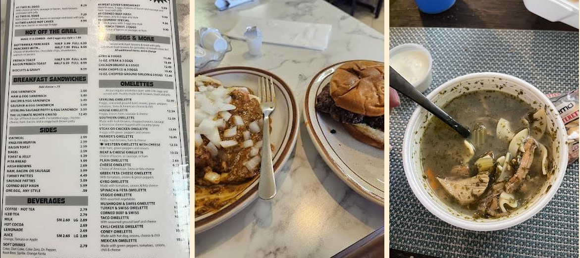 Yes! Try the Sterling Omelette, Coney Dog, and Chicken Greek Salad. Breakfast specials like Two XL Eggs and Buttermilk Pancakes are also favorites.